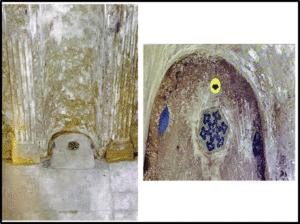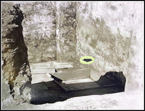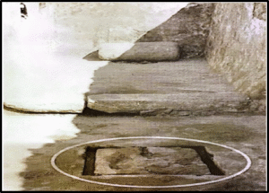 الجزء السفلي والعلوي من المحراب في حجرة مصلى النبي صلى الله عليه وآله، حيث يظهر بموضع سجوده صلى الله عليه وآله حجر مسدس الشكل قطره كقطر أصبع اليد، ووضع هذا الحجر في وسط المحراب