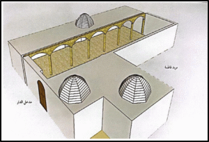 تخيلي ثلاثي الأبعاد لشكل الدار، والمسجد، وموضع المربد، ومدخل الدار، والقباب الثلاث التي كانت في عهد الفاسي.
